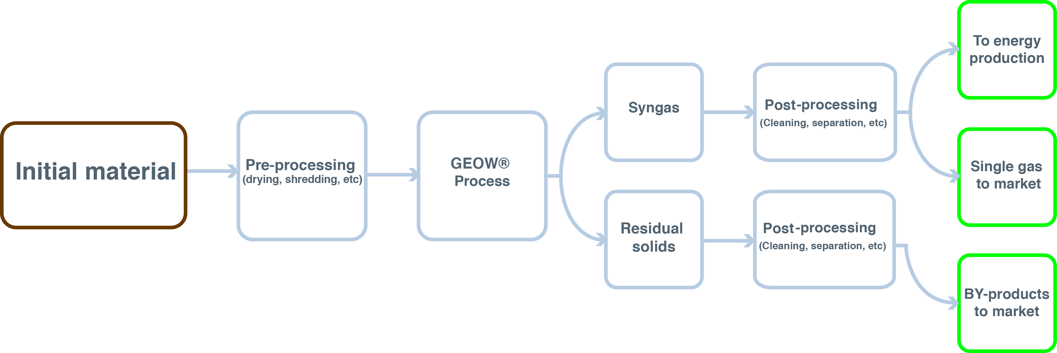 GEOW® is a patented thermochemical continuous process to convert a material containing available carbon into syngas and final inert residual solids.