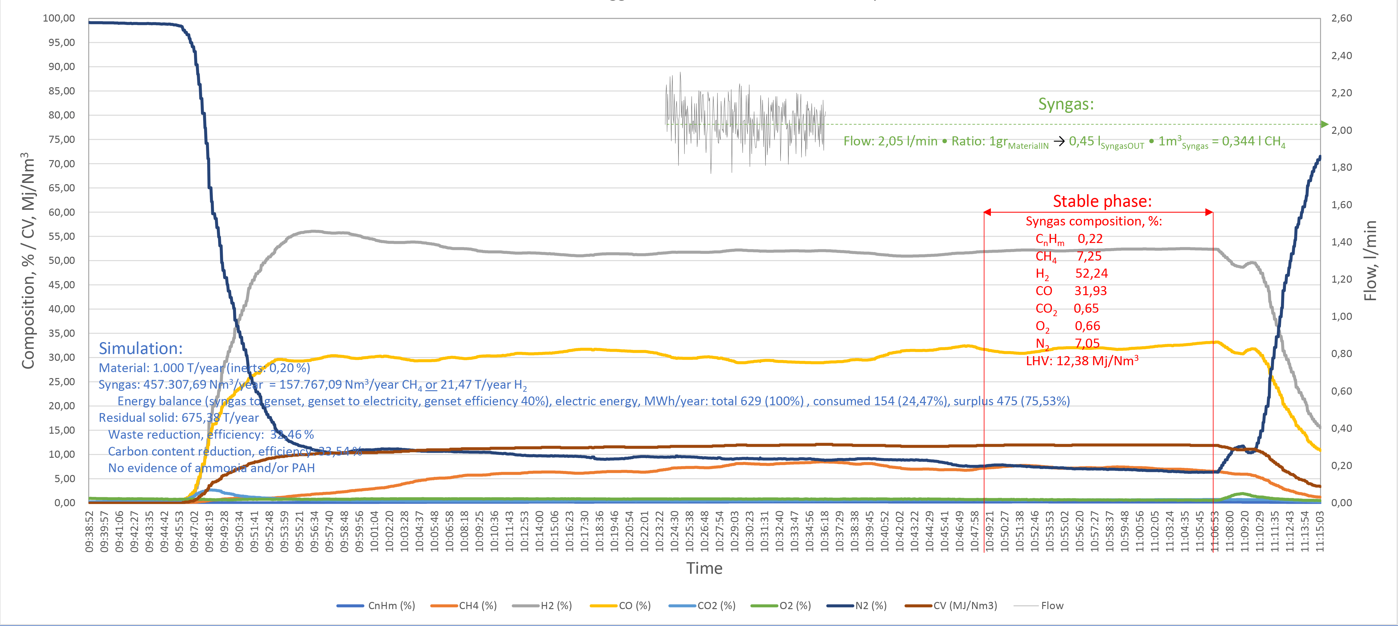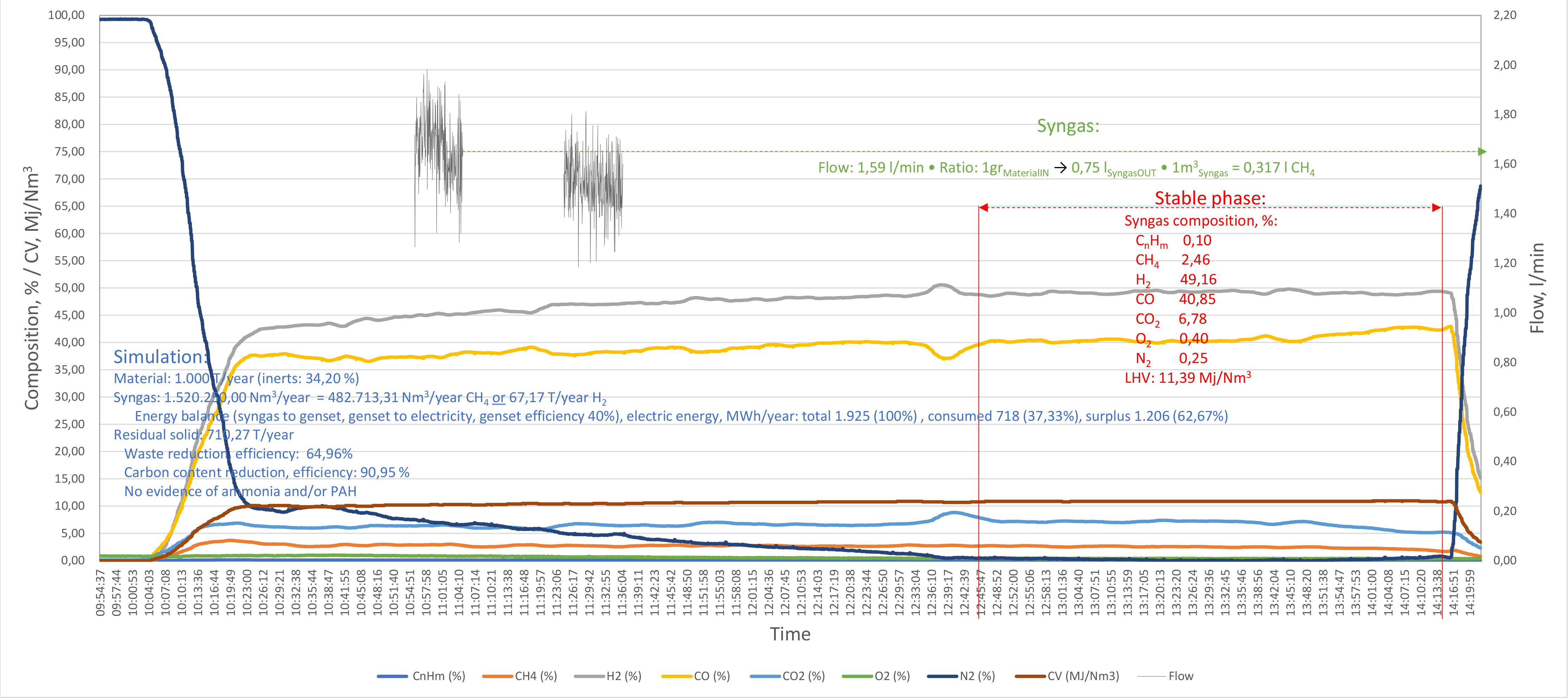 Gasification and pyrolysis have been tested on several materials under different process conditions.